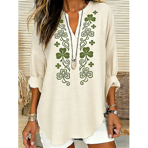 Camicia tunica da donna per il giorno di San Patrizio con grafica floreale trifoglio vintage quotidiana elegante a maniche lunghe colletto a V colletto regolare top quotidiani stampa bianca verde