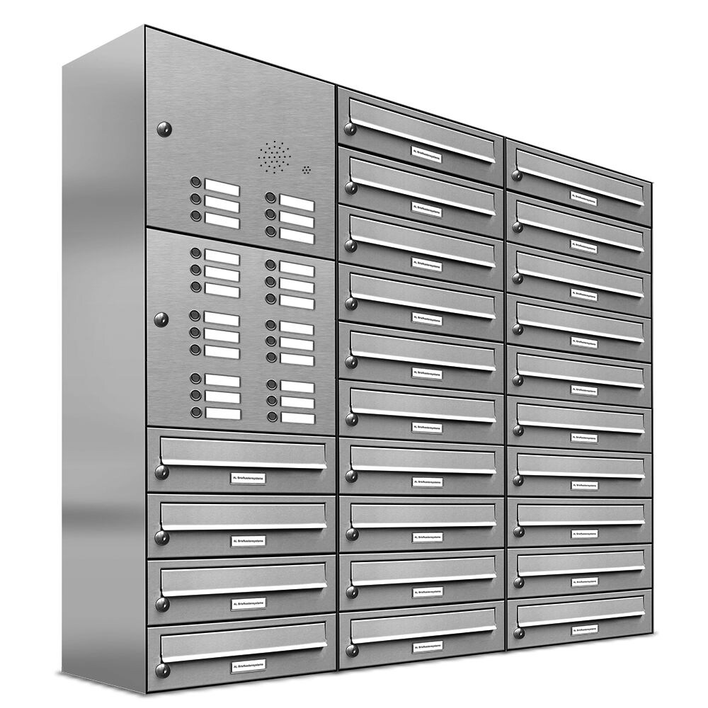 AL Briefkastensysteme 24 Fächer Premium Edelstahl Wand Briefkasten Anlage mit Klingeln, Post A4, modern, robust, wetterfest, Artikelnummer 132T24EA3KS