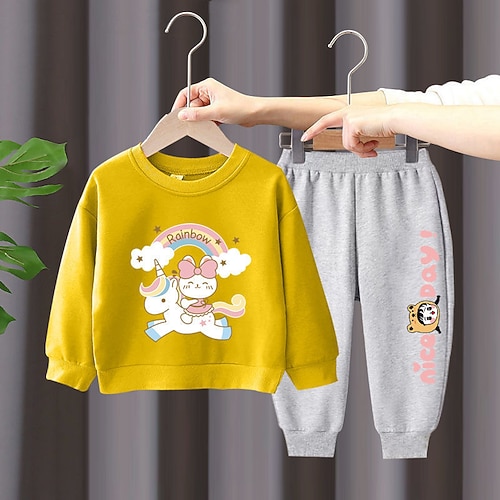 2 Pezzi Bambini Ragazze Arcobaleno Girocollo Set Felpa con cappuccio Pantaloni della tuta Impostato Manica Lunga Attivo All'aperto Cotone 3-7 Anni Primavera Maglione unicorno nero bei pantaloni