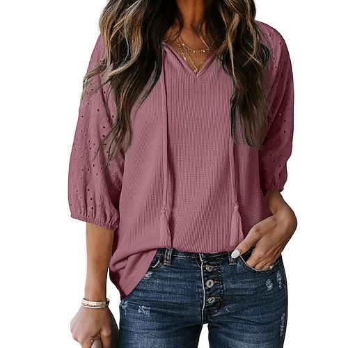 Per donna Blusa Semplice Elegante Manica 3/4 Scollo a V Top Regolari Quotidiano Ferie Uscire Patchwork Traforato Nero Bianco Verde chiaro Rosa Blu marino Primavera Autunno