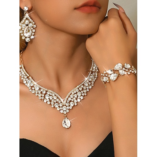 set di collana, orecchini e bracciale in cristallo rosso da donna, gioielli vistosi con strass color oro, stile glamour ed elegante per le feste eventi serali
