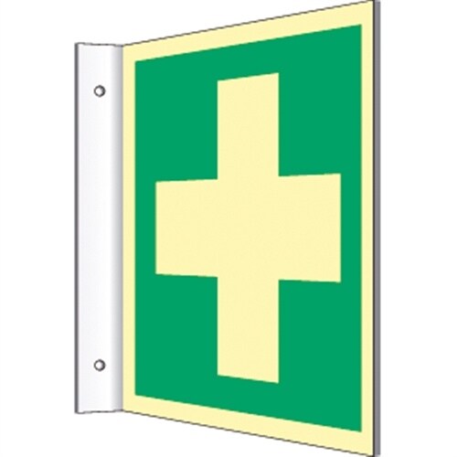 Fahnenschild Erste Hilfe, ISO 7010, Kunststoff, nachleucht.,160-mcd, 148x148 mm
