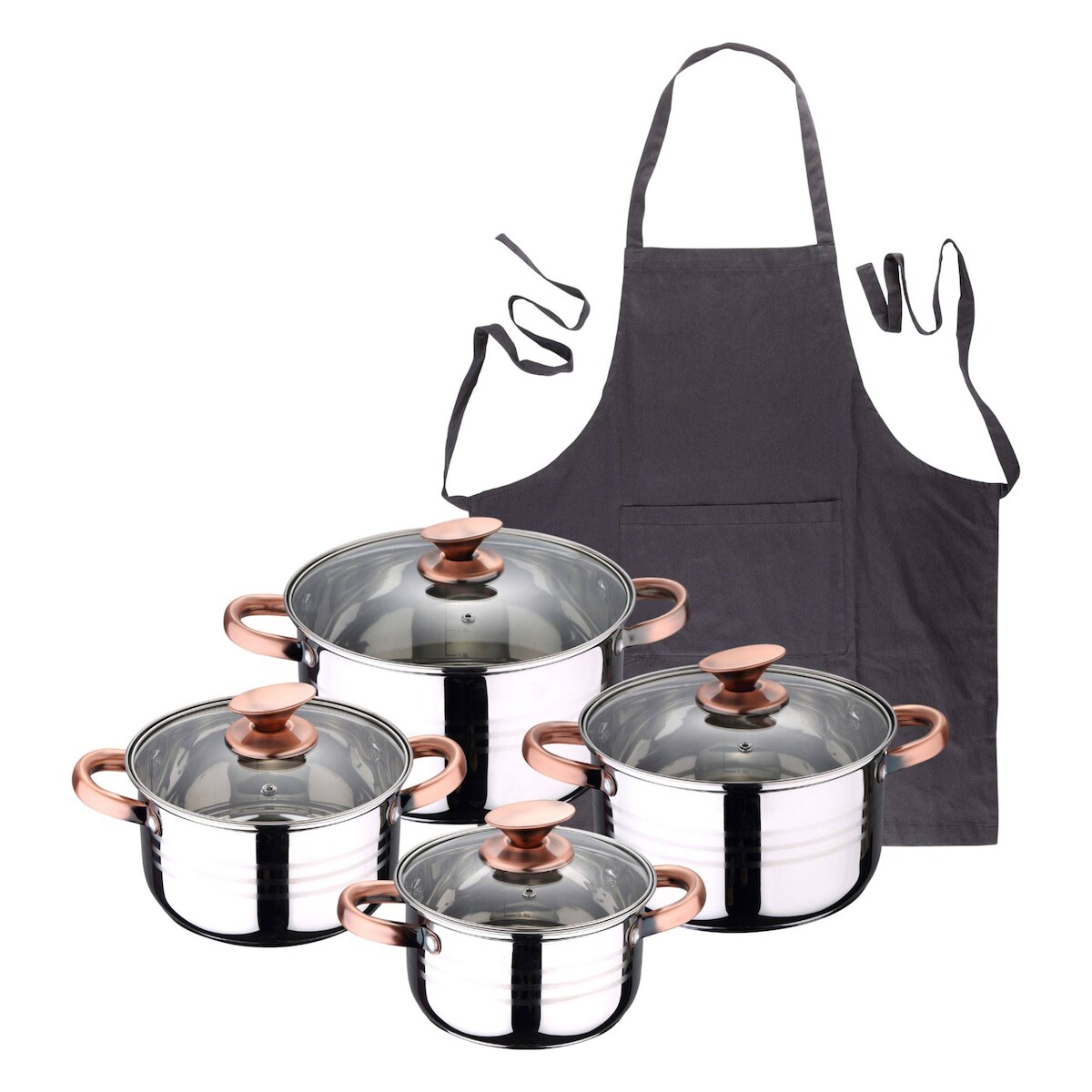 BERGNER - NONA 8-teiliges Kochgeschirr-Set (16/18/20/24cm) aus Edelstahl, induktionsgeeignet,mit dunkelgrauer Schürze aus 100 % Baumwolle 75 x 80 cm