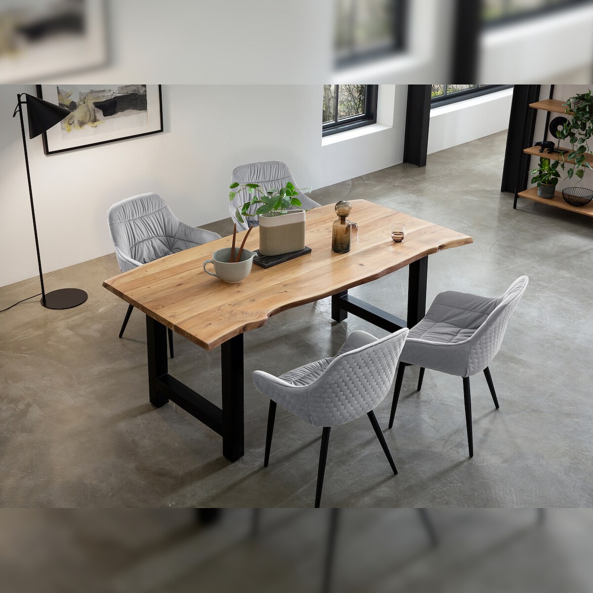 SalesFever Tischgruppe 160 x 85 cm | 5-tlg. | 35 mm Platte Akazie natur | H-Gestell Metall schwarz | 4 Stühle aus Samt | hellgrau – schwarz