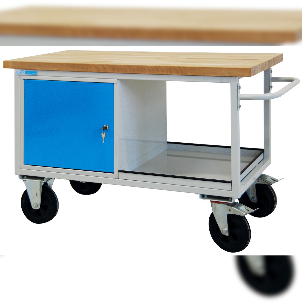 PROREGAL Mobile Werkbank Rhino mit Ablagefach + 1 Tür | HxBxT 83x130x60cm | Traglast 500kg | Lichtgrau/Lichtblau