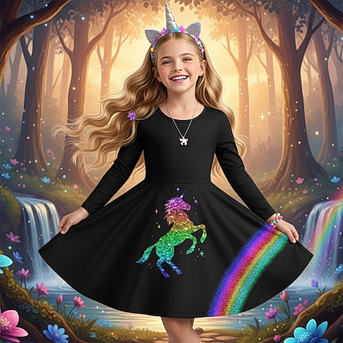ragazze' 3D Grafico Arcobaleno Unicorno Abito Manica Lunga Stampa 3D Primavera Autunno Performance Vacanza Feste Casual Principessa Bello Bambini 4-12 Anni Vestito Casual Abito a trapezio Lunghezza