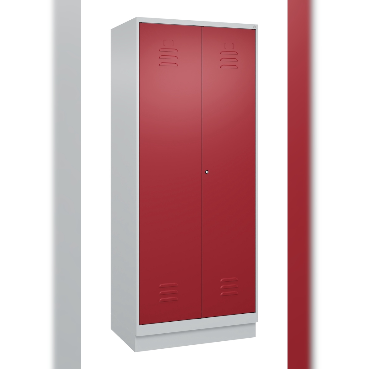 C+P Aufbewahrungs Doppel-Spind Classic PLUS, Sockel, 2 Abteile je 4 Fachböden, HxBxT 195x80x50cm, Zylinderschloss, Hellgrau/Rubinrot von PROREGAL
