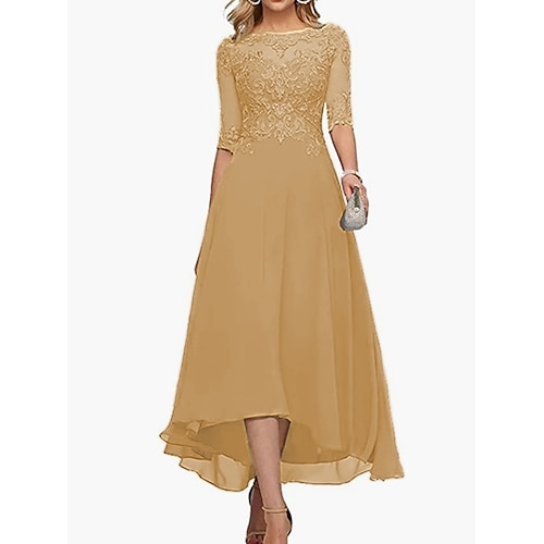 Linea ad A Asimmetrico Lunghezza al pavimento Abito da Sera Da principessa Abito formale Elegante Setoso Mezza Manica Girocollo Matrimonio Formale Abito Champagne per la Madre della Sposa Raso