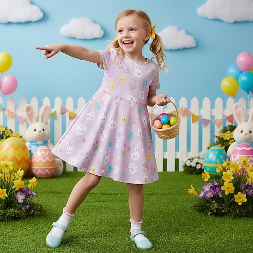 Pasqua ragazze' 3D Grafico Coniglio Abito Manica Corta Stampa 3D Estate Primavera Quotidiano Vacanza Feste Carino Essenziale Casual Bambini 4-12 Anni Vestito Casual Abito a trapezio Lunghezza al
