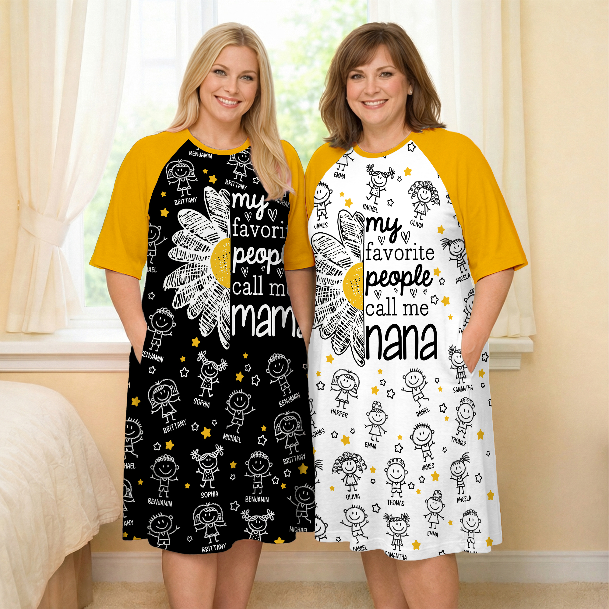 Personalizzato 1-16 Cartoon Line Art Camicia da notte per bambini con nomi e tasca laterale Indossare quotidianamente Festa della mamma Regalo di compleanno per la nonna Mamma
