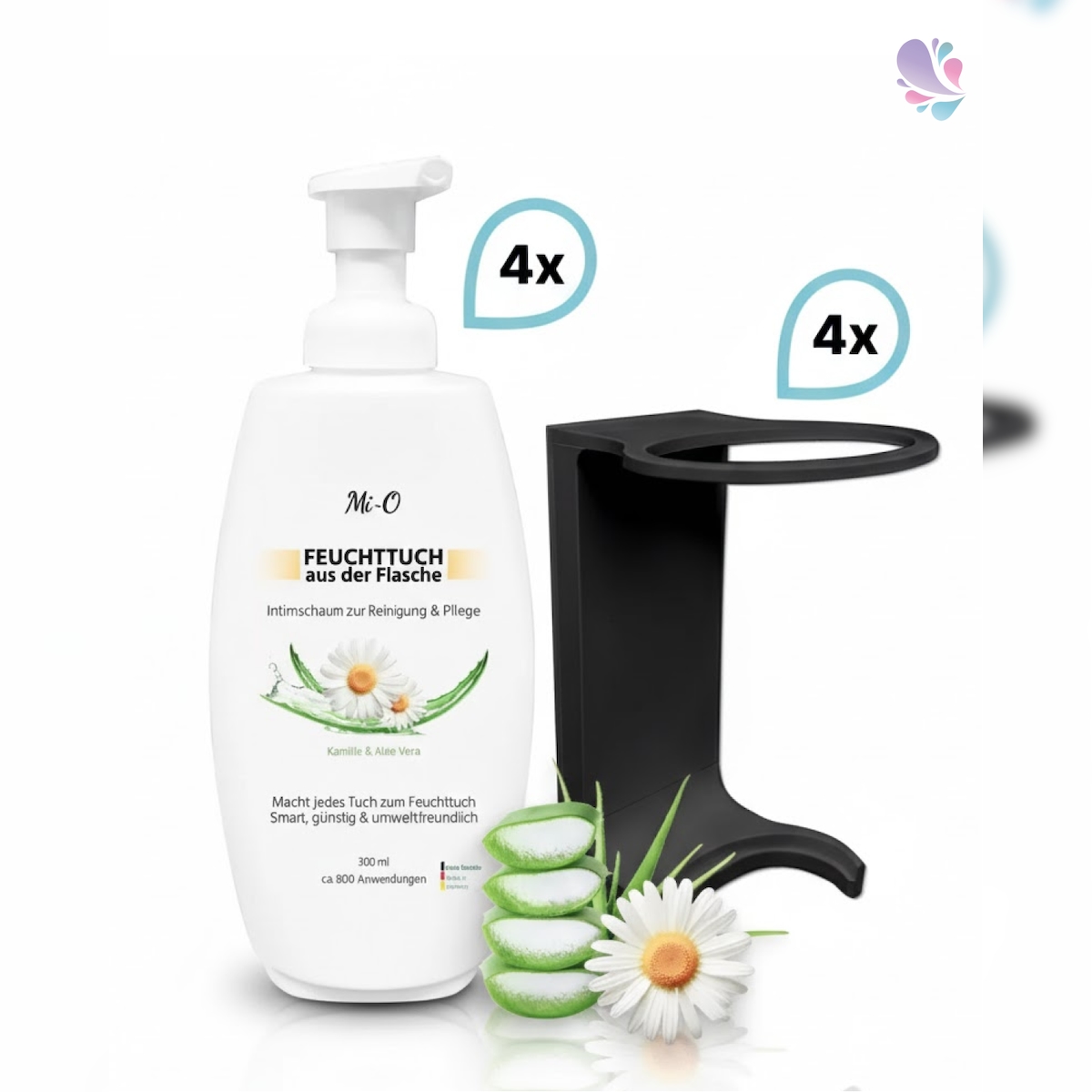 Blanc HYGIENIC SET: Feuchttuch aus der Flasche 4x300 ml + 4x Wandhalterung schwarz, Intim Reinigungs- & Pflegeschaum