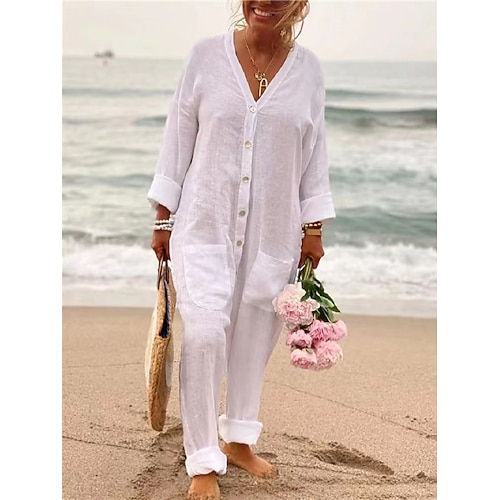 Per donna Normale Tuta Attivo Tinta unica Manica Lunga Gamba larga Scollo a V Tasca Bottoni Quotidiano Vacanza Vestibilità comoda Bianco Estate