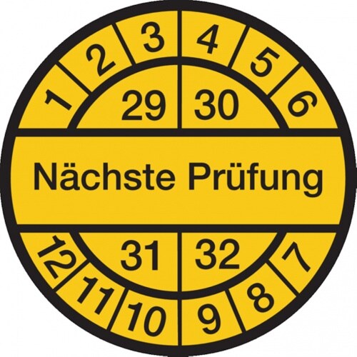 König Werbeanlagen Dreifke® Prüfplakette, BetrSichV Nächster Prüftermin, gelb/schwa - 30 mm Folie selbstklebend