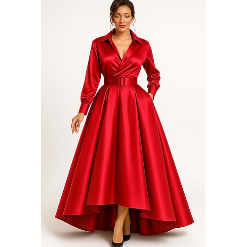 Linea ad A Asimmetrico Lunghezza al pavimento Abito da invitata a nozze Abito Formale Abito svasato Abito da cerimonia per signora Manica Lunga Colletto a Camicia Elegante Vintage Formale Raso con