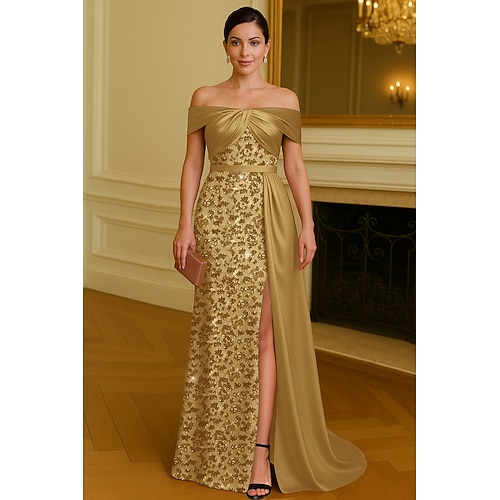 Linea ad A Lunghezza al pavimento Abiti da Ballo Elegante Manica Corta Senza Spalle Natale Formale Con Paillettes Senza schiena con Pieghe