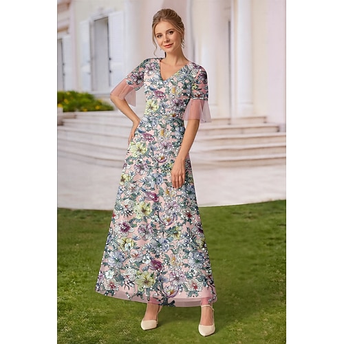 Linea ad A Abito Lunghezza al pavimento Lunghezza alla caviglia Perline ricamate Vestito da Festa Abito da Cocktail Abito da cerimonia per signora Manica Corta Scollo a V Elegante Vintage Formale