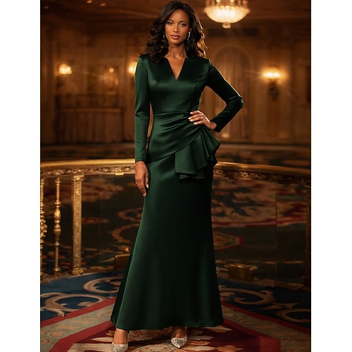 Linea ad A Lunghezza al pavimento Abito da invitata a nozze Abito Formale Abito da sera Abito da cerimonia per signora Manica Lunga Scollo a V Elegante Formale Ospite di nozze Raso con Arricciatura
