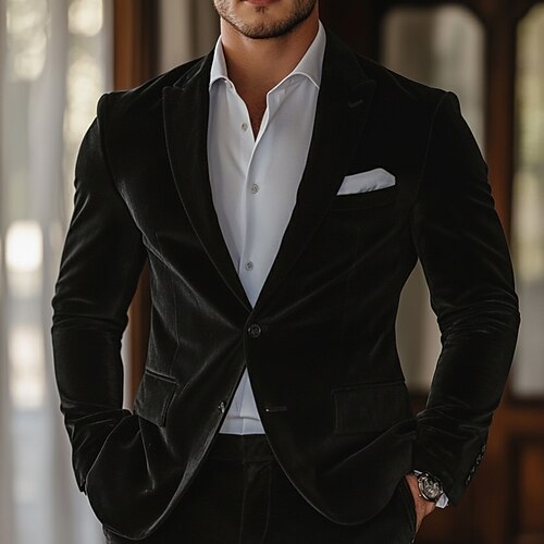 Uomo Affari Casuale Abito di velluto Bavero classico Nero Giallo Quotidiano Affari Tinta unita Vestibilità su misura 2 pezzi Monopetto Due Bottoni
