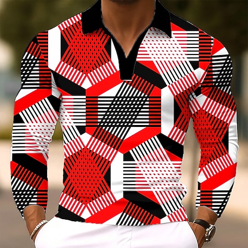 Per uomo Geometrico Polo Manica Lunga Magliette polo Bavero Casual All'aperto Streetwear Athleisure Abbigliamento quotidiano Stampa 3D Bottoni Primavera Autunno Inverno Rosso Blu