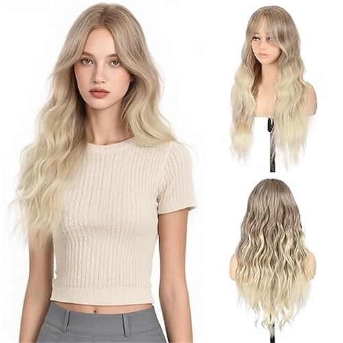 parrucca grigia lunga ondulata con frangia a tendina per donna, parrucca sintetica grigio argento da 26 pollici, parrucche in fibra di capelli resistenti al calore dall'aspetto naturale, per uso