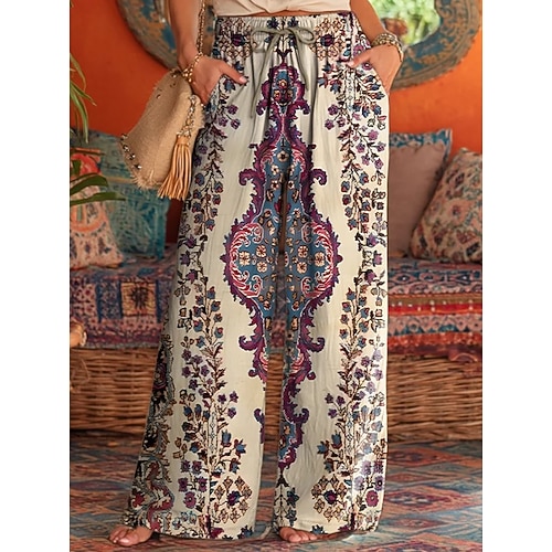 Per donna Gamba larga Chinos Vacanza Vintage Stile Etnico Lunghezza intera Vita Alta Coulisse Patchwork Stampa Inelastico Abbigliamento Quotidiano Ferie Nero Verde Chiaro crème Verde scuro Estate