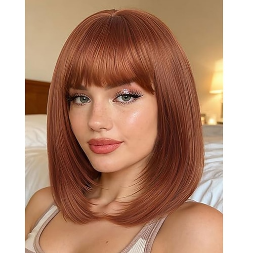 Parrucche a strati con frangia, corte, da 14 pollici, castano misto, senza colla, sintetiche, lisce e pronte all'uso, per donne, cuoio capelluto realistico, uso quotidiano per cosplay