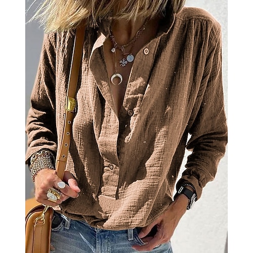 Per donna Camicie di cotone e lino Tinta unica Elegante Casual Manica Lunga Scollo a V Top Regolari Quotidiano Bottoni Bianco Rosa Rosso Blu Grigio Estate Primavera
