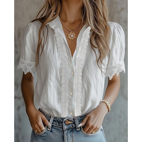 Camicia Camicia in pizzo Blusa Top patchwork in rete Per donna Nero Bianco Verde Tinta unica Pizzo Pulsante Strada Giornaliero Di tendenza Colletto S