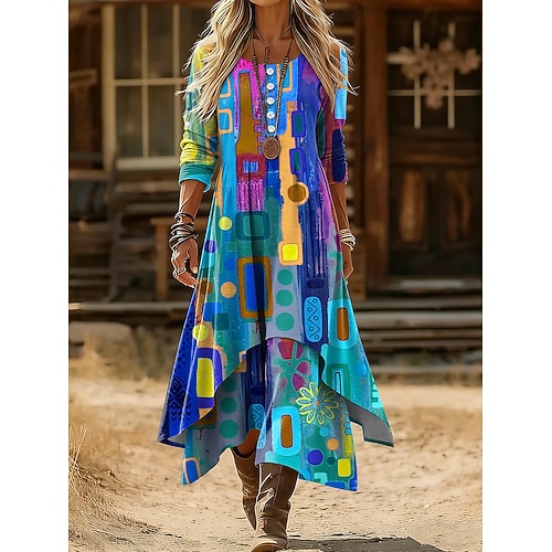 Per donna Abito Midi Abito a Tubino Casual Quotidiano Ferie Vestibilità regolare Grafico Geometrico Manica Lunga Girocollo Blu Giallo Viola Primavera Inverno