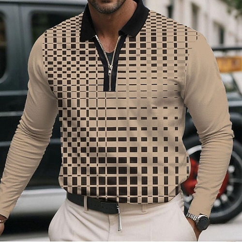 Per uomo Motivo Geometrico Polo Manica Lunga Collo ripiegato Moderno Casual Sport Outdoor Athleisure Casual Quotidiano Cerniera Stampa 3D Primavera Autunno Inverno Marrone scuro Marrone chiaro