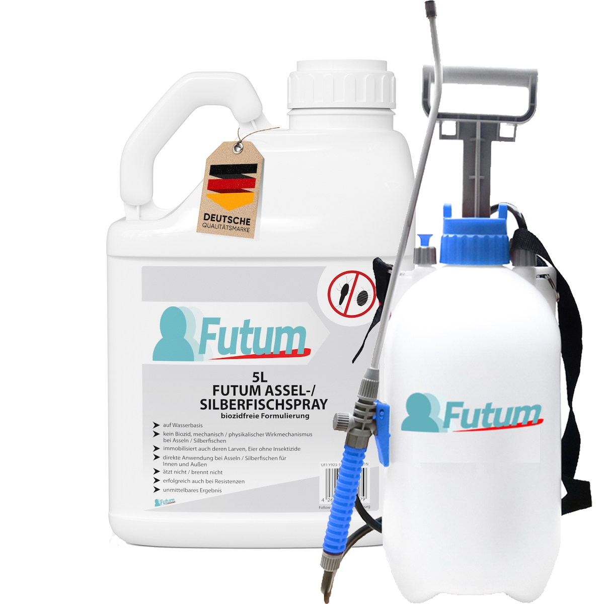 FUTUM 5L Silberfischspray / Asselspray bekämpft Insekten, Eier, Larven ohne Biozide auf Wasserbasis, Sofortwirkung ohne Flecken + 2L Sprüher