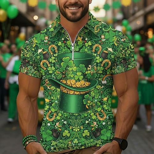 Per uomo Polo Polo con zip a un quarto Quotidiano San Patrizio Zip a un quarto Manica Corta Moda Essenziale Grafico Trifoglio Stampa 3D Estate Primavera Vestibilità aderente Verde translucido Verde