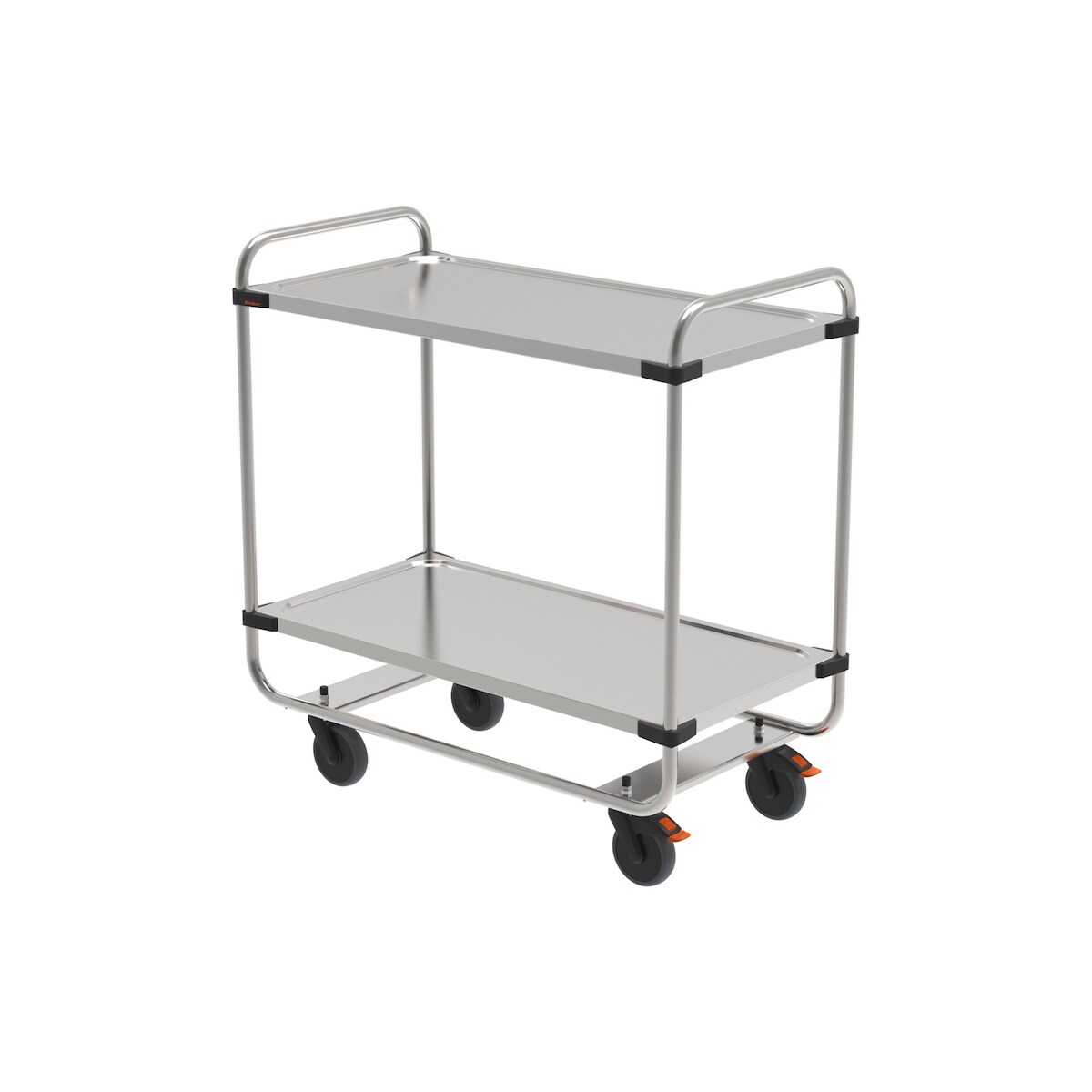 Rieber Servierwagen aus Edelstahl, schwere Ausführung, Rundrohr-Schieberahmen, 2 Borde, Bordgröße 1000 x 500 mm, montiert