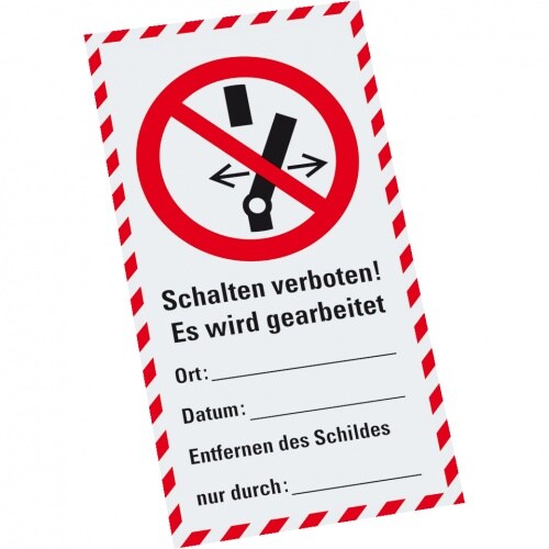 Aufkleber I Wartungsaufkleber Schalten verboten!..., Papier, selbstklebend, 80x150mm, 100/Block, ASR A1.3, DIN EN ISO 7010 P031