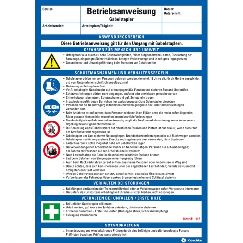 König Werbeanlagen Dreifke® Maschinenbetriebsanweisung Gabelstapler, Kunststoff, 210x297mm, ASR A1.3, DIN EN ISO 7010