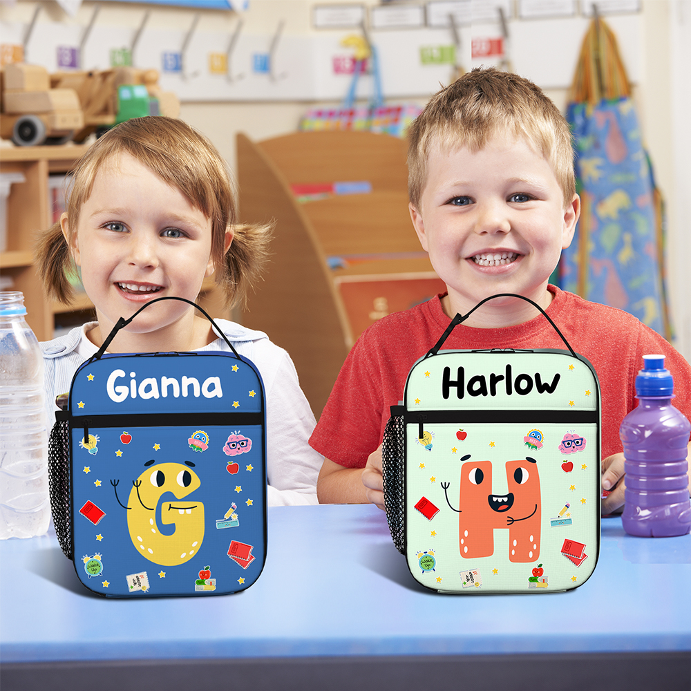Personalizzato Carino Cartoon Lettera portatile isolata Borsa per il pranzo con nome e tasca in rete Ritorno a scuola Picnic Regalo di compleanno per ragazzi Ragazze