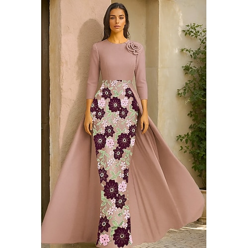 Linea ad A Sirena Tromba Lunghezza al pavimento Abito da Sera Abito da ballo con sopragonna Abito formale Elegante Manica 3/4 Girocollo Festa in giardino Matrimonio Raso Elasticizzato con Fiori 3D