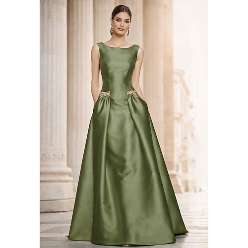 Linea ad A Lunghezza al pavimento Abito da Sera Elegante Brillanti Senza Maniche Scollo a Barca Matrimonio Formale Raso con Arricciato Cristalli