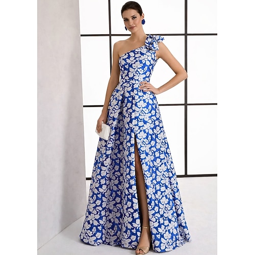 Linea ad A Lunghezza al pavimento Abito da Sera Elegante Floreale Senza Maniche Monospalla Festa in giardino Matrimonio Raso con Stampa floreale Fiocco/Fiocchi