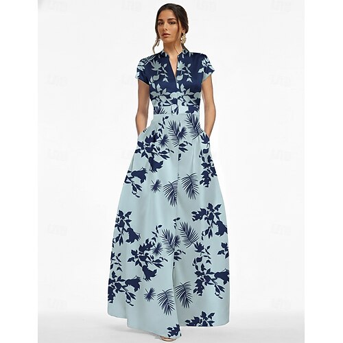 Linea ad A Lunghezza al pavimento Abito da Sera Abito formale Elegante Setoso Manica Corta Scollo a V Matrimonio Formale Raso con Stampa floreale