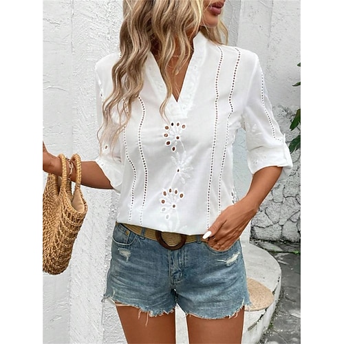 Per donna Top estivi Blusa Top traforato Arricciato Patchwork Ricamato Semplice Elegante Signore Classico Manica Lunga Collo Alto Top Regolari Quotidiano Ferie Uscire Bianco Estate Primavera