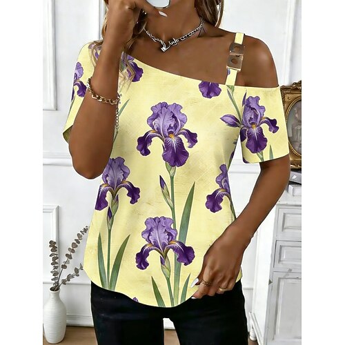 Per donna Maglietta Stampato Floreale Grafico Elegante Classico Casual Manica Corta Collo asimmetrico Top Regolari Quotidiano Uscire Weekend Blu Giallo Rosa Estate Primavera
