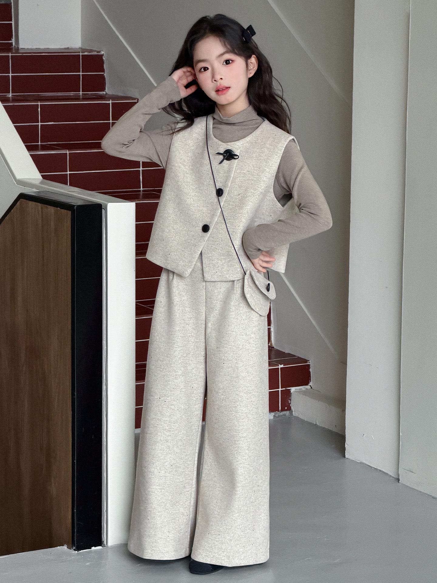 Trendy Driekwart Set voor Meisjes 2026: Lente/Herfst Koreaanse Stijl Blouse, Wollen Vest & Wijde Broek 120cm