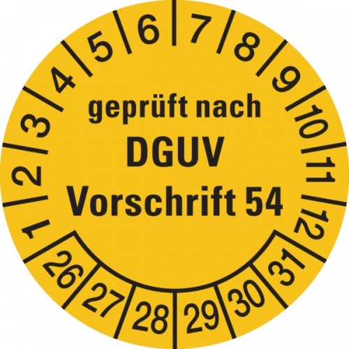 König Werbeanlagen Prüfplakette ab 26, geprüft nach DGUV Vorschrift 54, gelb/schwarz, Folie, Ø 30mm - Bogen = 10 Plaketten - 30 mm Folie selbstklebend