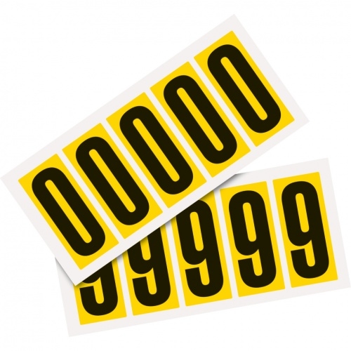 Aufkleber I Kombipackung Ziffer 0-9, gelb/schwarz, Folie, SH 75mm, 38x88mm, 10 je Ziffer/Packung