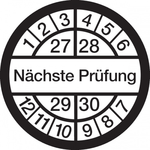 König Werbeanlagen Prüfplakette ab 27, Nächste Prüfung, weiß/schwarz, Ø 16 mm - Bogen = 10 Plaketten - 16 mm Folie selbstklebend