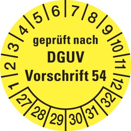 König Werbeanlagen Prüfplakette ab 27, geprüft nach DGUV Vorschrift 54, gelb/schwarz, Folie, Ø 30mm - Bogen = 10 Plaketten - 30 mm Folie selbstklebend