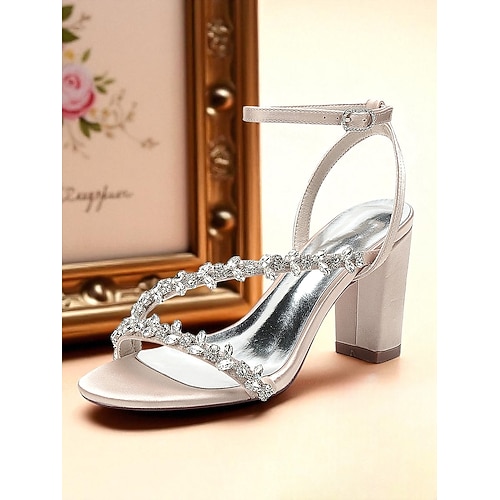 scarpe da sposa con tacco a spillo in raso bianco con cinturino alla caviglia e cristalli per la sposa