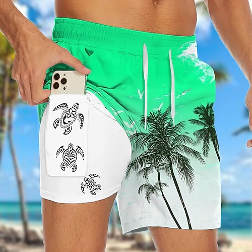 Per uomo Albero di Cocco Piante Tropicali Tartaruga di mare Pantaloncini foderati Pantaloncini da bagno 2 in 1 Pantaloncini da mare Misura del girovita medio Hawaiano Ferie Tasche Laterali Con Fodera