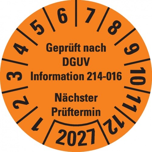 Dreifke® Prüfplakette Geprüft DGUV Info. 214-016 NP 2027,orange,Dokufolie,Ø 30mm,18 St/Bogen